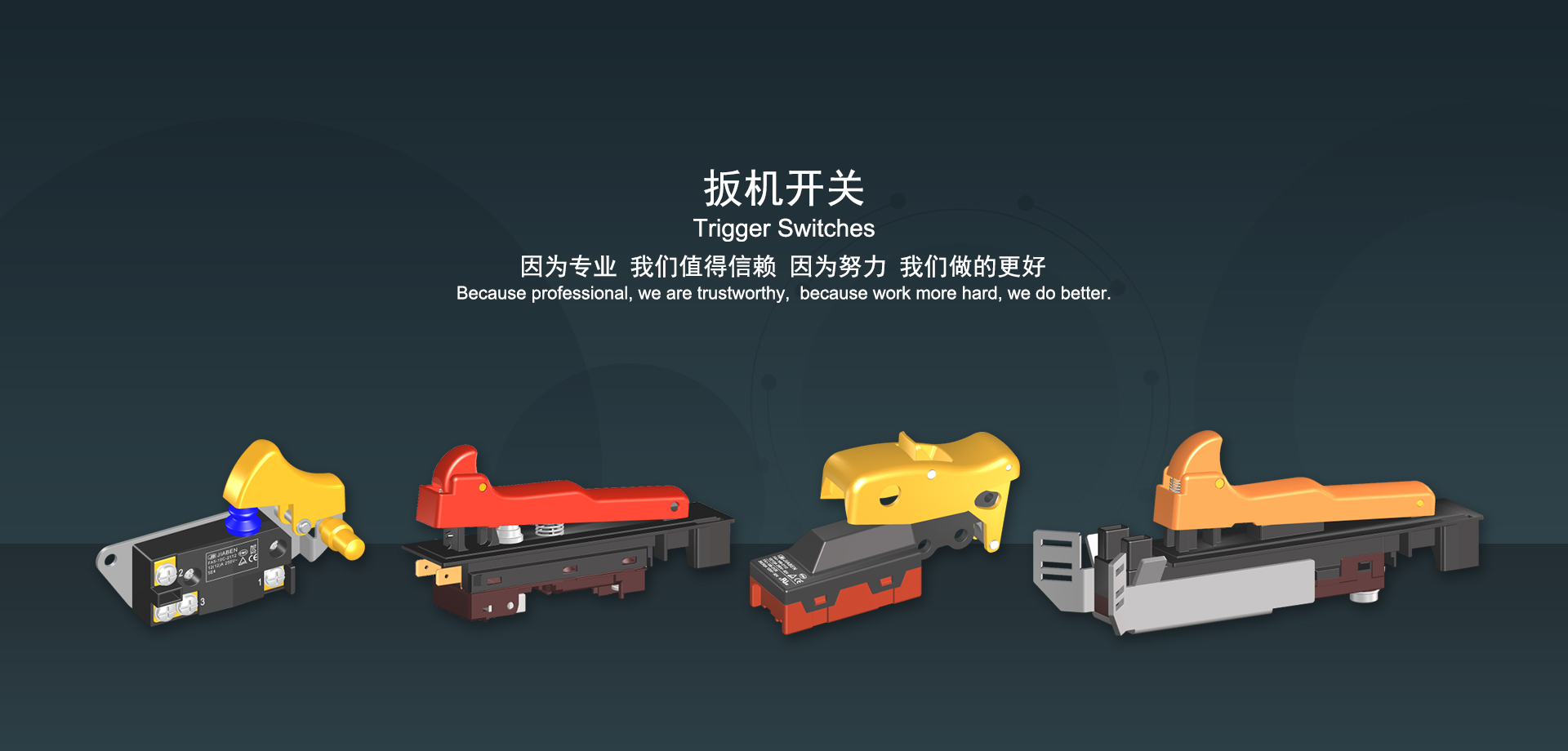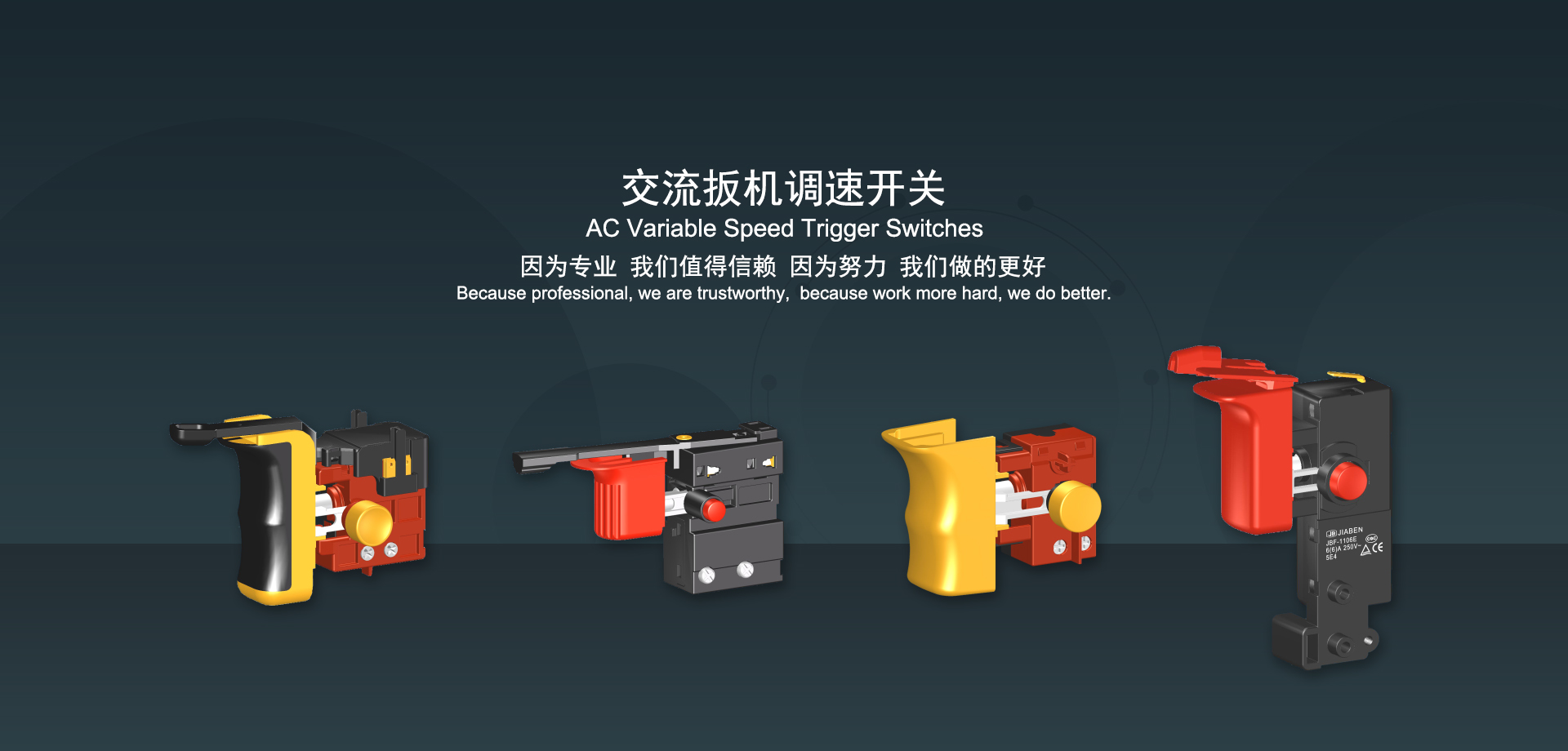浙江佳奔電子有限公司始建于1986年,坐落于浙江省樂(lè)清市虹橋鎮(zhèn)東電子信息產(chǎn)業(yè)園內(nèi),現(xiàn)有職工700多人,資產(chǎn)總額超3億元。公司主要經(jīng)營(yíng)“JIABEN”牌微動(dòng)開(kāi)關(guān)、蹺板開(kāi)關(guān)、按鈕開(kāi)關(guān)、扳機(jī)開(kāi)關(guān)、調(diào)速開(kāi)關(guān)和電位器開(kāi)關(guān)等各類(lèi)交、直流器具開(kāi)關(guān)和各類(lèi)交、直流線路板模塊等產(chǎn)品,主要應(yīng)用于交、直流電動(dòng)工具、電動(dòng)園林工具、清潔器具、家用電器和小型機(jī)床等行業(yè),是集產(chǎn)品設(shè)計(jì)、研發(fā)、制造、銷(xiāo)售和服務(wù)于一體的國(guó)家高新技術(shù)企業(yè)。JIABEN was founded in 1986, located in East Electronic Information Industry Park, Hongqiao Town, Yueqing City, Zhejiang Proviance, existing staff more than 700 peoples, more than 300 million RMB worth of assets. Company is mainly engaged in "JIABEN" brand Micro Switch, Rocker Switch, Push-button Switch, Trigger Switch, Speed Regulating Switch, Potentiometer Switch and other kinds of appliance switch and all kinds of AC or DC circuit board module, such as more than 100 series, 8000 kinds of models of products, mainly used in AC or DC Power-tools, Power Gardening Tools, Cleaning Appliances, Household Appliances and Small Machine Tool and other industries, is the collection product design, research and development, manufacturing, sales and service in one of the national high and new technology enterprise.